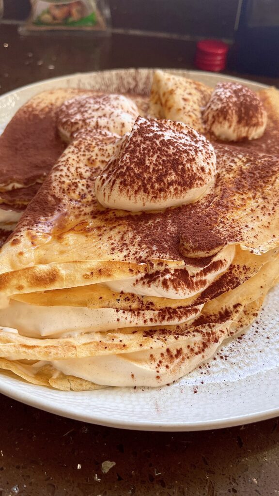 Tiramisu Crepes are a delightful fusion of two classic desserts, combining the delicate texture of French crepes with the rich, coffee-infused flavors of Italian tiramisu. These light, fluffy crepes are filled with a creamy mascarpone mixture, layered with hints of espresso and cocoa, creating a decadent dessert perfect for any occasion.